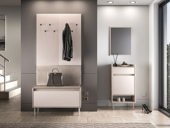 Wieszak Voco to smukły panel ścienny, który łączy funkcjonalność z nowoczesnym designem. Front w eleganckim odcieniu Cashmere zestawiono z korpusem w ciepłym dekorze Dąb Cremona Terracotta, co nadaje meblowi przytulny i stylowy charakter. Montaż na ścianie pozwala oszczędzić miejsce na podłodze, zapewniając swobodną komunikację nawet w węższym korytarzu.