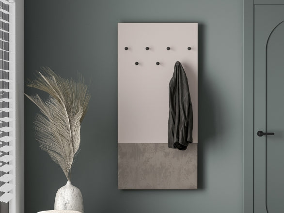 Voco to wiszący panel wieszakowy zaprojektowany z myślą o wygodnej organizacji okryć wierzchnich w przedpokoju, garderobie lub biurze domowym. Front w eleganckim odcieniu Cashmere zestawiono z korpusem w ciepłym dekorze Dąb Cremona Terracotta, co nadaje meblowi nowoczesny, a jednocześnie przytulny charakter.