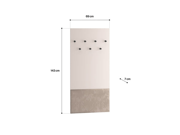 Szerokość 69 cm zapewnia miejsce na kilka sztuk odzieży, a wysokość 143 cm pozwala wygodnie odwiesić także dłuższe płaszcze. Na płycie znajdują się dwa poziome rzędy gałek, które umożliwiają logiczne rozdzielenie kurtek, płaszczy i akcesoriów tak, aby każdy domownik miał swoje miejsce. Prostokątna wstawka dekoracyjna w dolnej części panelu porządkuje wizualnie całość i podkreśla nowoczesny charakter wieszaka.
