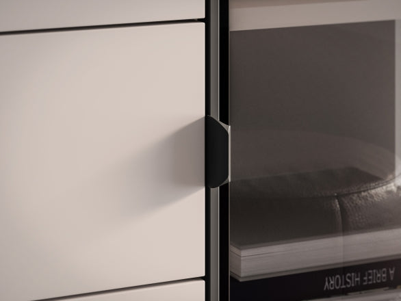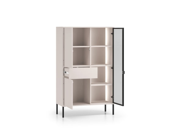 Witryna została zaprojektowana z myślą o wygodnym przechowywaniu. Trzy drzwi oraz pojemna szuflada umożliwiają funkcjonalny podział zawartości, a cztery praktyczne półki zapewniają odpowiednią ilość miejsca na zastawę stołową, książki, dokumenty czy elementy dekoracyjne. Szuflada sprawdzi się idealnie do przechowywania drobnych przedmiotów, które warto mieć pod ręką, zachowując jednocześnie estetyczny porządek.