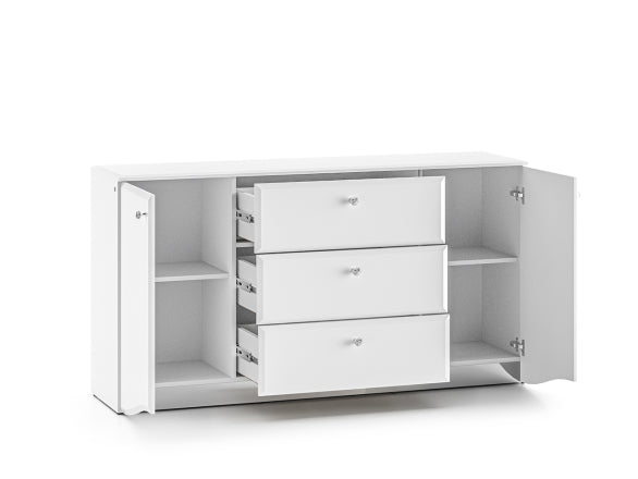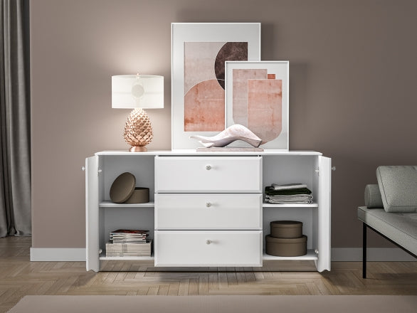 Przemyślany układ przechowywania pozwala wygodnie zorganizować zarówno drobne akcesoria, jak i większe elementy. Centralnie umieszczone trzy szuflady ułatwiają segregację dokumentów, tekstyliów czy przedmiotów codziennego użytku, natomiast dwie boczne szafki zapewniają dodatkową, zamkniętą przestrzeń. Wewnątrz znajdują się dwie półki, które pomagają maksymalnie wykorzystać wysokość mebla i utrzymać porządek.