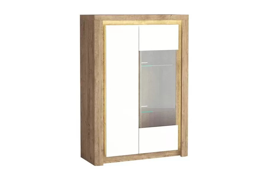 Przeszklona witryna w kolorze ribbeck z białymi frontami w połysku to elegancki i funkcjonalny mebel, który wspaniale uzupełni Twoje wnętrze. Witryna została podzielona na dwie części, co dodaje jej unikalnego charakteru.