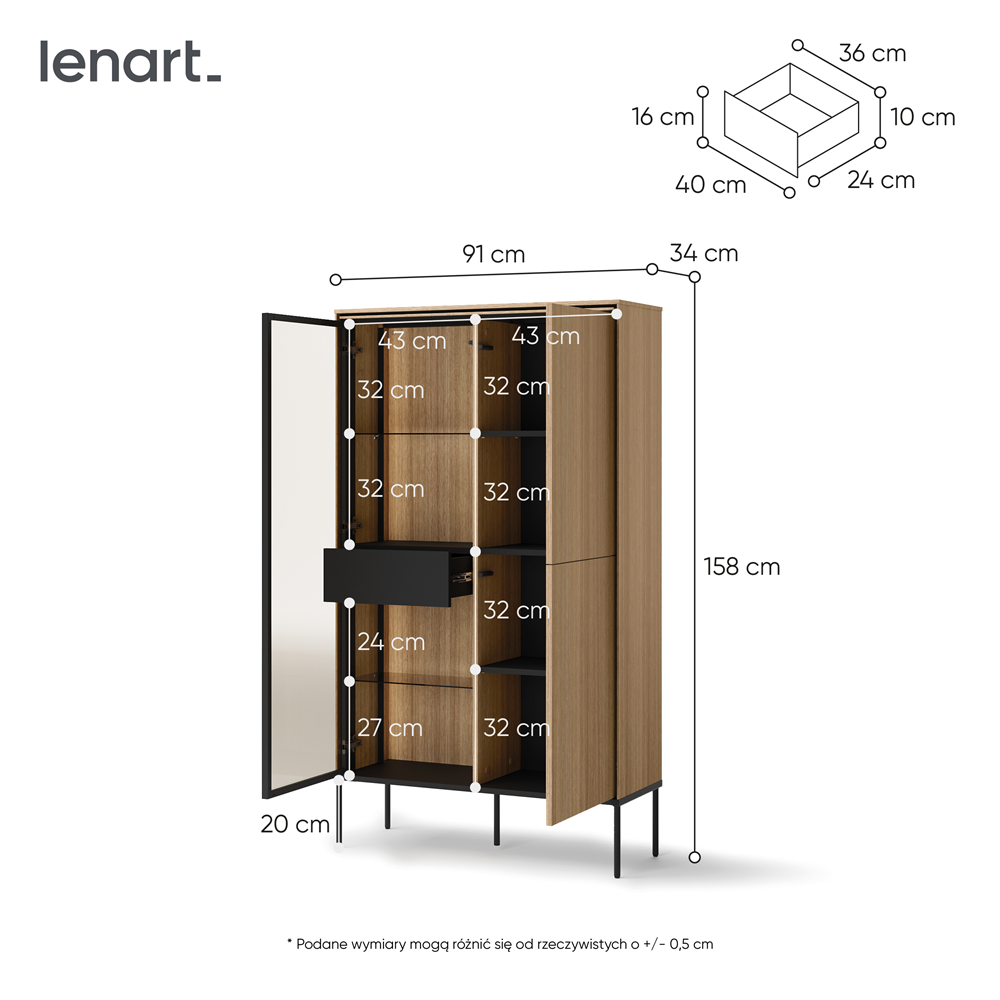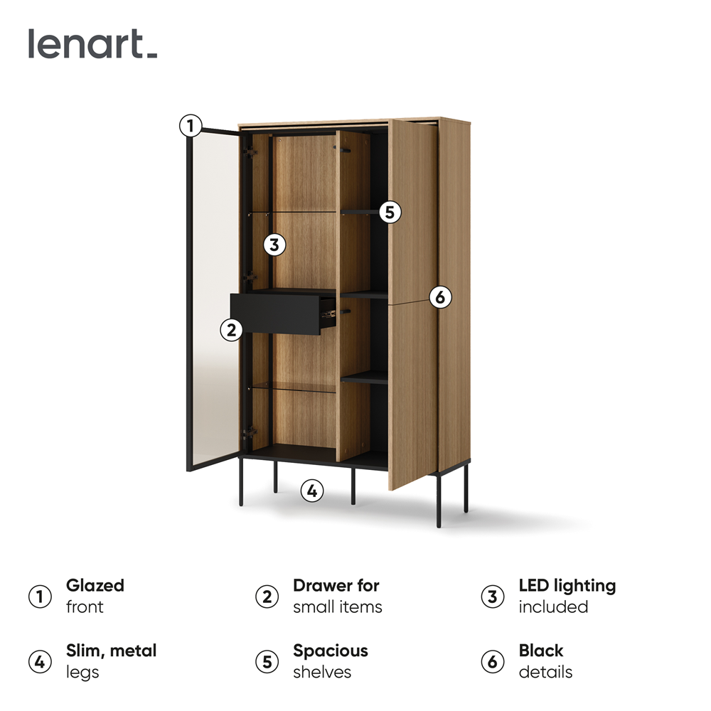 Witryna oferuje przestronne półki oraz zamykane szafki, które umożliwiają zarówno efektowną ekspozycję, jak i wygodne przechowywanie. To doskonałe rozwiązanie dla miłośników elegancji i porządku.